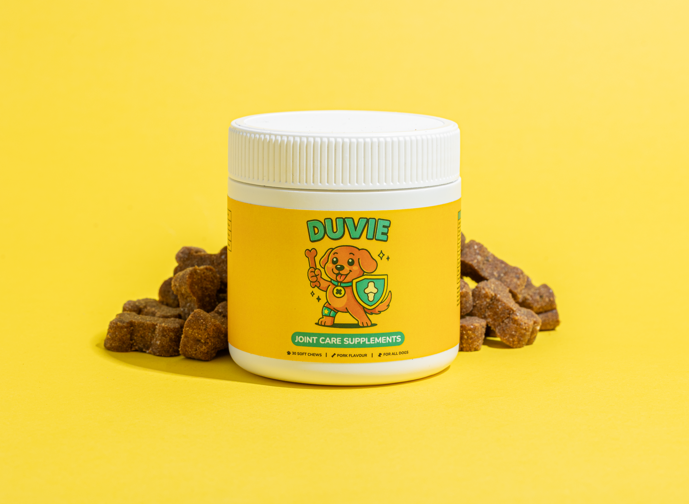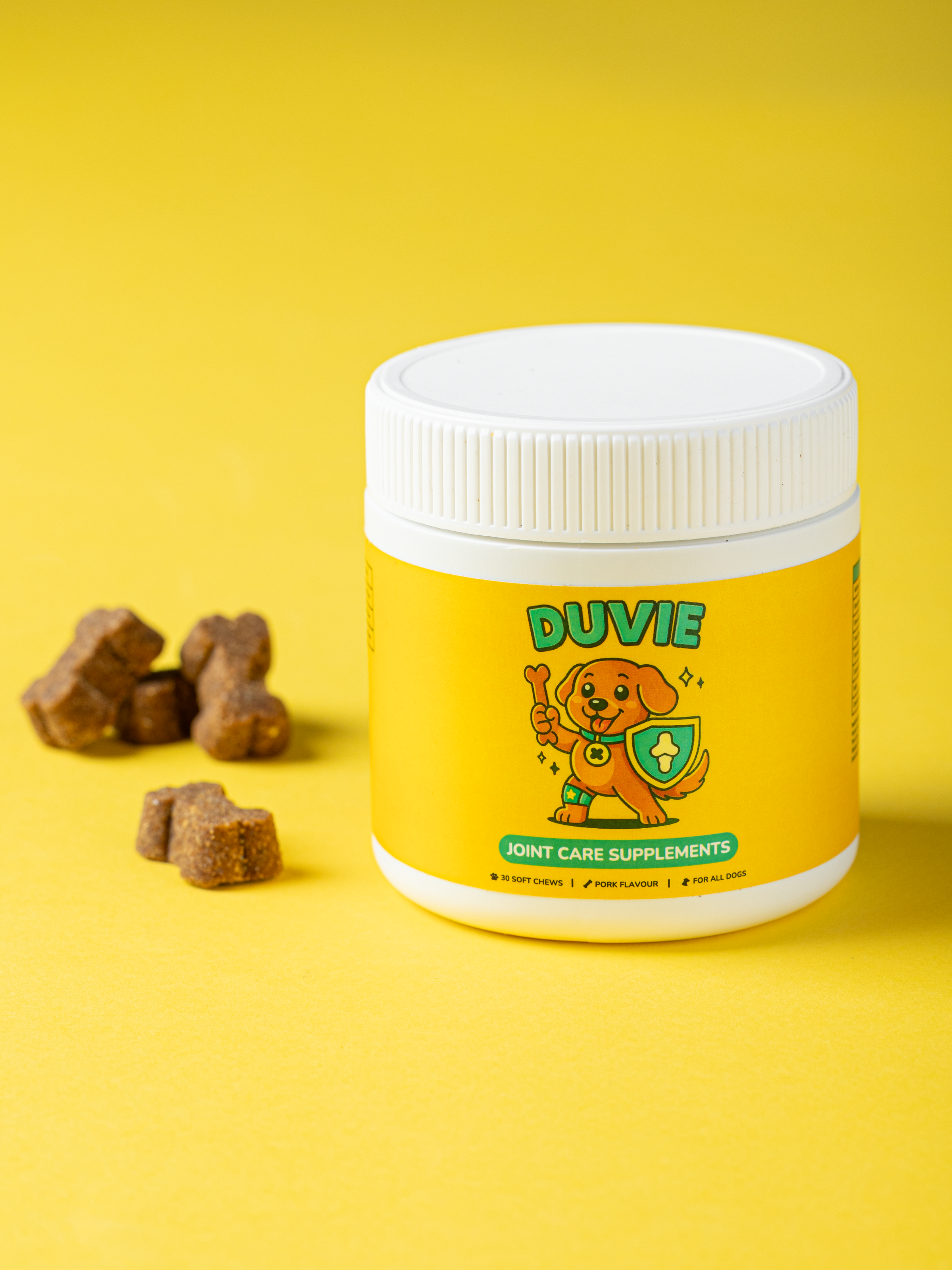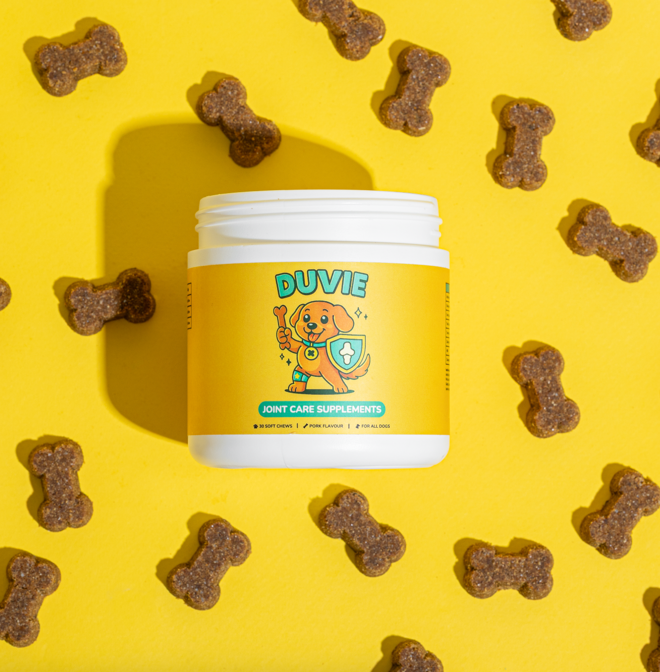 Say hello to happier hips and zoomier zoomies. Duvie Joint Care is our daily soft chew made with vet-backed ingredients like glucosamine, green-lipped mussel, omega fatty acids, turmeric, and MSM — wrapped in a tasty bacon vibe they’ll sit for, roll for, and absolutely drool for. It’s simple: one cheerful chew, lots of wag, more play. Because feeling good should be a treat.